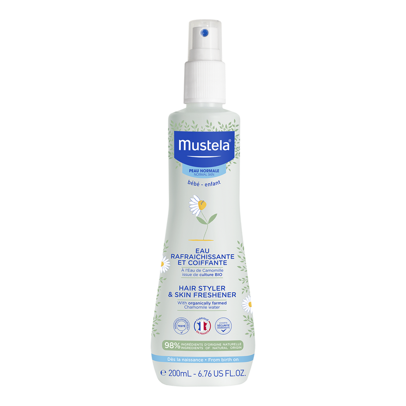 Mustela Hair Styler & Skin Freshener (200ml) is a gentle, alcohol-free spray designed to refresh and delicately scent your baby's skin while helping to style their hair. Suitable for use from birth , it offers a mild fragrance and is formulated to respect the delicate nature of infant skin.